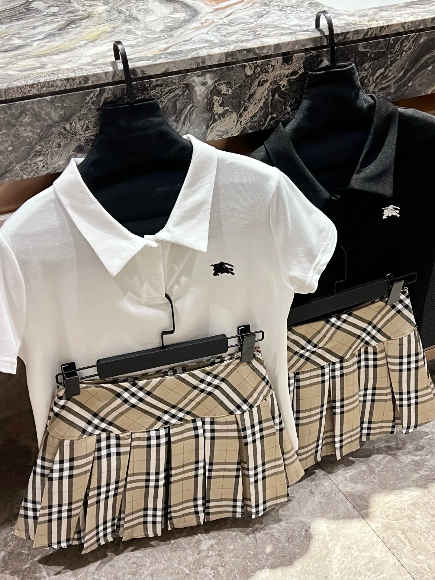 Burberry BBR Warhorse Embroidered Custom Fabric Logo Lapel Short-Sleeved Top with Plaid Pleated Skirt Set