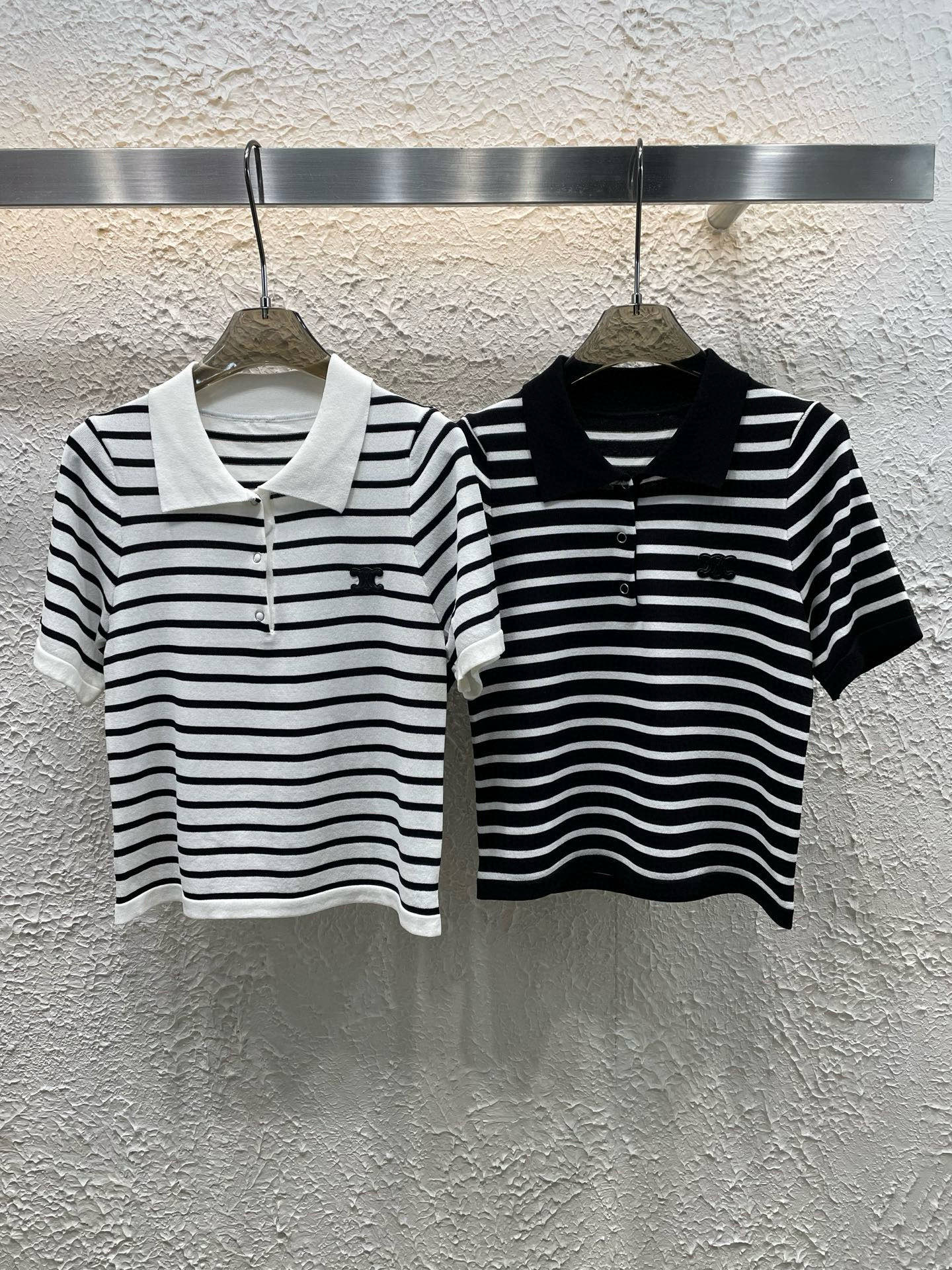 Celine Arc de Triomphe leather logo striped lapel knit short-sleeve top