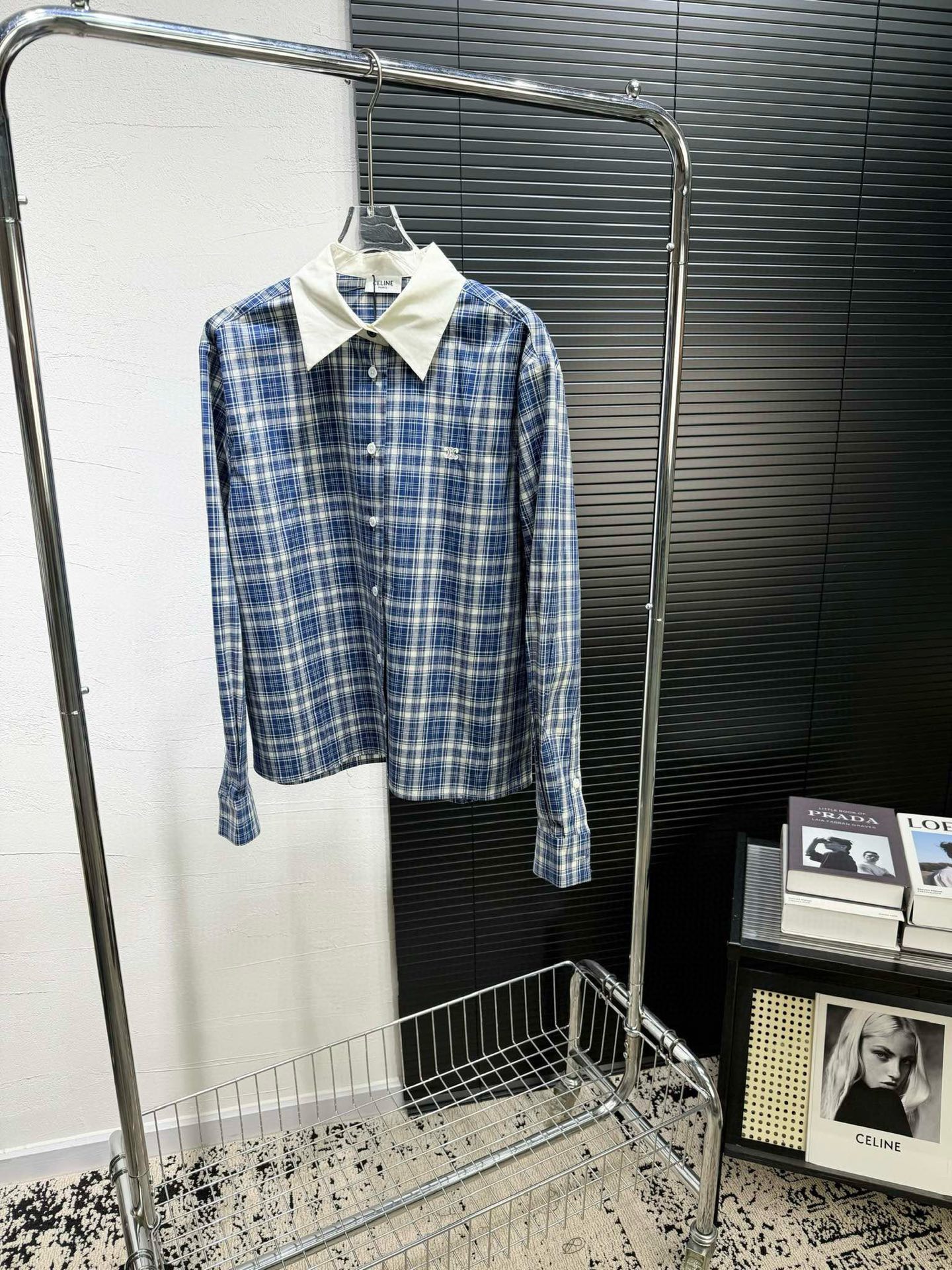 Celine Arc de Triomphe Embroidered Lapel Blue Small Check Shirt