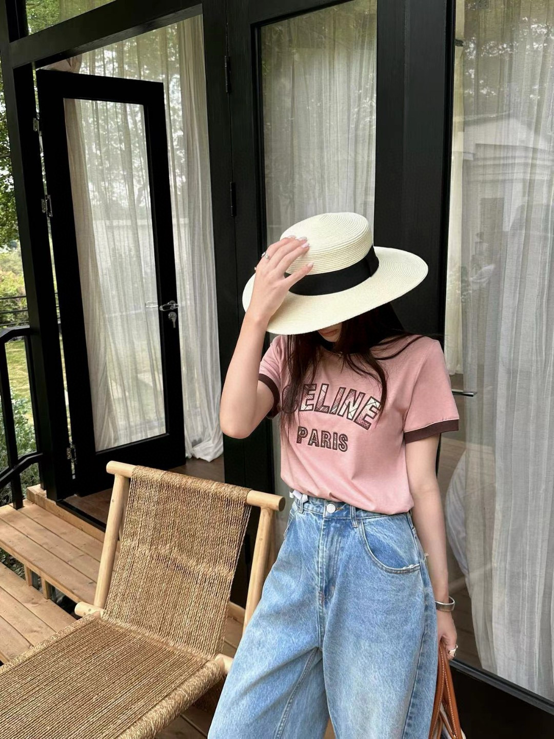 Premium Celine Short Sleeves Pink Plaid Luxury
