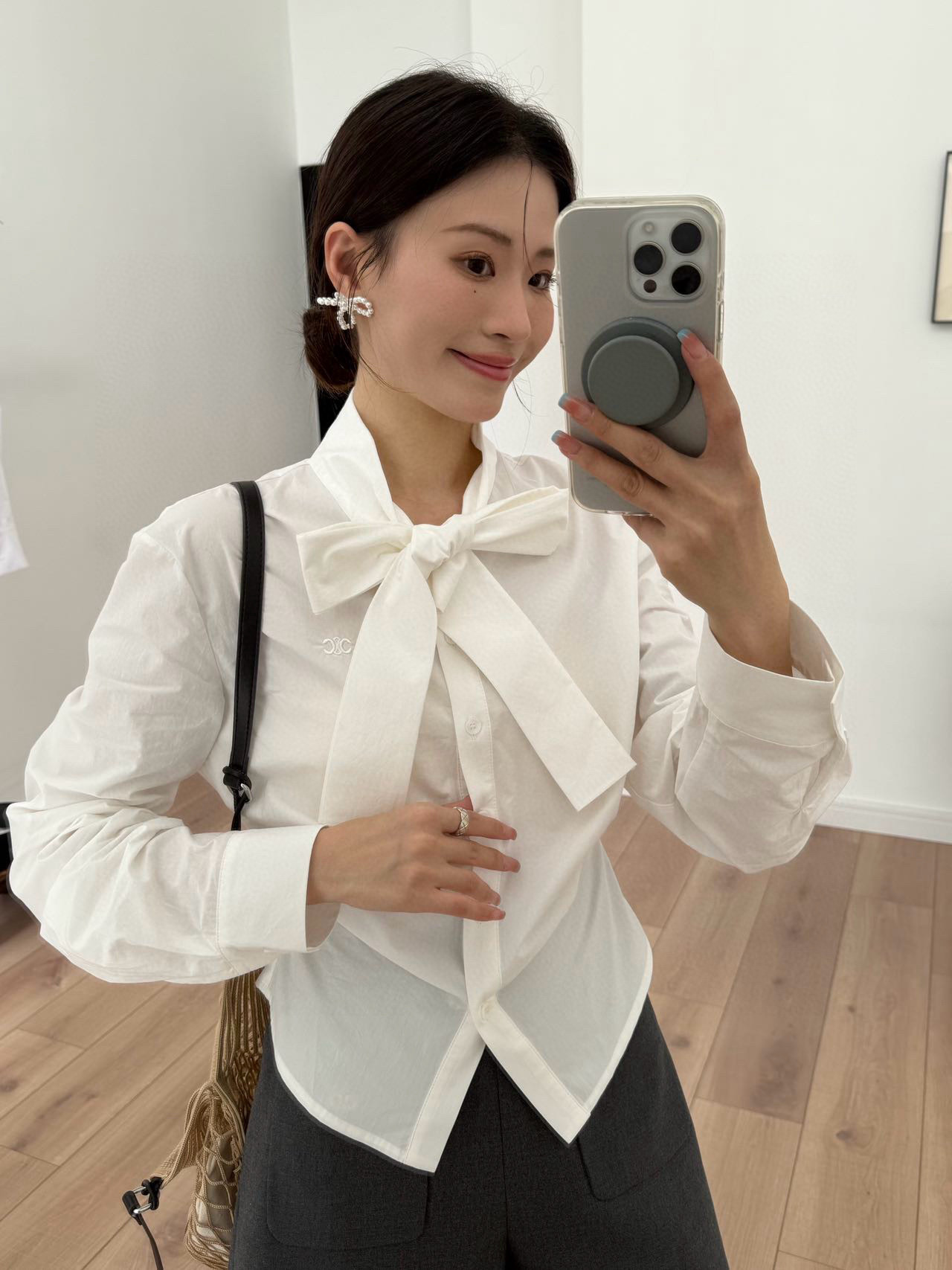 Celine Arc de Triomphe Embroidered Heavily Pleated Back Tie Bow Shirt