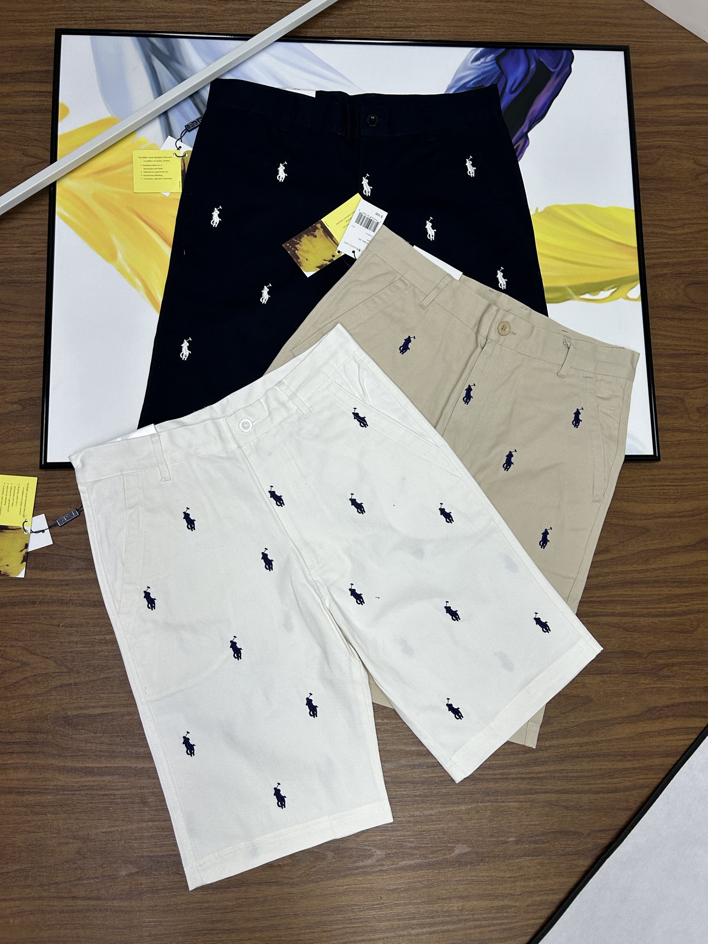 New summer Ralph Lauren all-over embroidered shorts. These casual washed cotton shorts feature an all-over logo and a small pony logo. Comfortable, 100% cotton, washed and shaped with imported machine-embroidered logos. Custom-made in three colors, the fabric is made from combed Lycra cotton and features an all-over pony logo embroidery on a million-needle imported embroidery machine. Perfect for both business and casual wear, these shorts are refreshing.